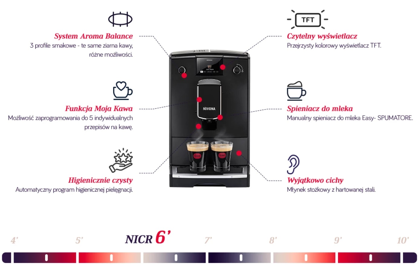 NIVONA NICR 6'90 to cichy, nowoczesny ekspres dla tych, którzy lubią kawy mleczne i chcą, w domowym zaciszu, poczuć moc ziaren parzonych przez baristę. Przejrzysty cyfrowy wyświetlacz TFT oraz możliwość podświetlenia filiżanek sprawią, że przygotowanie kawy będzie wyjątkowym doświadczeniem.
