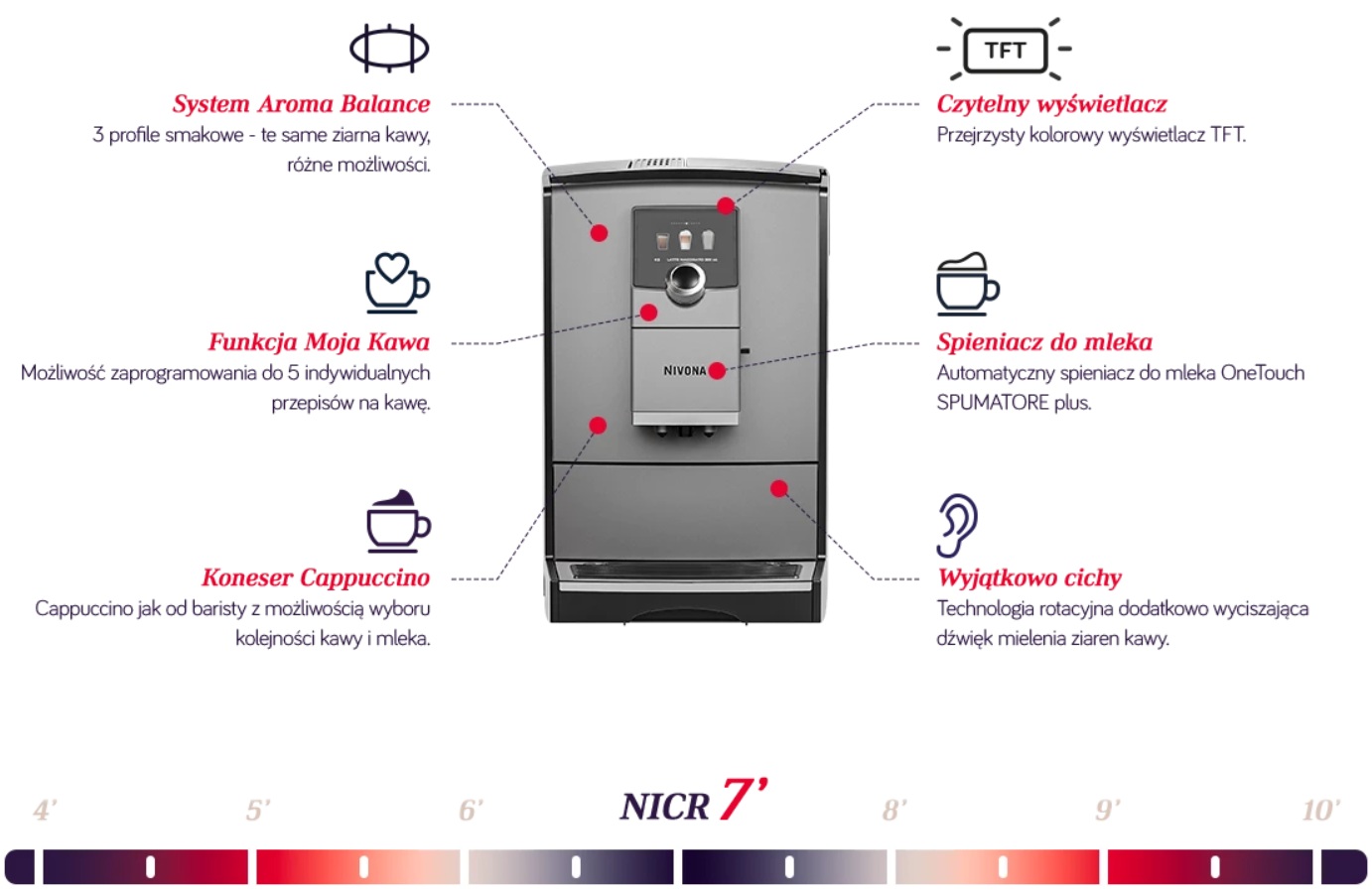 Kompaktowe, minimalistyczne i nowoczesne ekspresy NIVONA NICR serii 7 będą ozdobą każdego wnętrza. Niezależnie od Twojego stylu, ich ponadczasowy design Cię zachwyci. Dopracowane detale i uniwersalna, stonowana kolorystyka przypadną do gustu nawet najbardziej wymagającym użytkownikom.