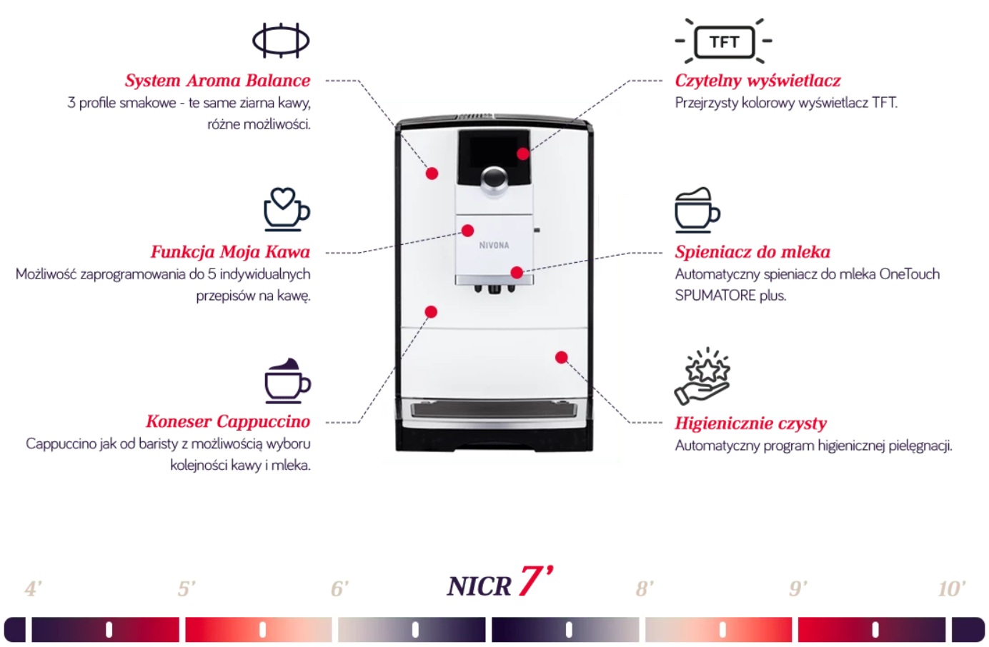 Kompaktowe, minimalistyczne i nowoczesne ekspresy NIVONA NICR serii 7 będą ozdobą każdego wnętrza. Niezależnie od Twojego stylu, ich ponadczasowy design Cię zachwyci. Dopracowane detale i uniwersalna, stonowana kolorystyka przypadną do gustu nawet najbardziej wymagającym użytkownikom.